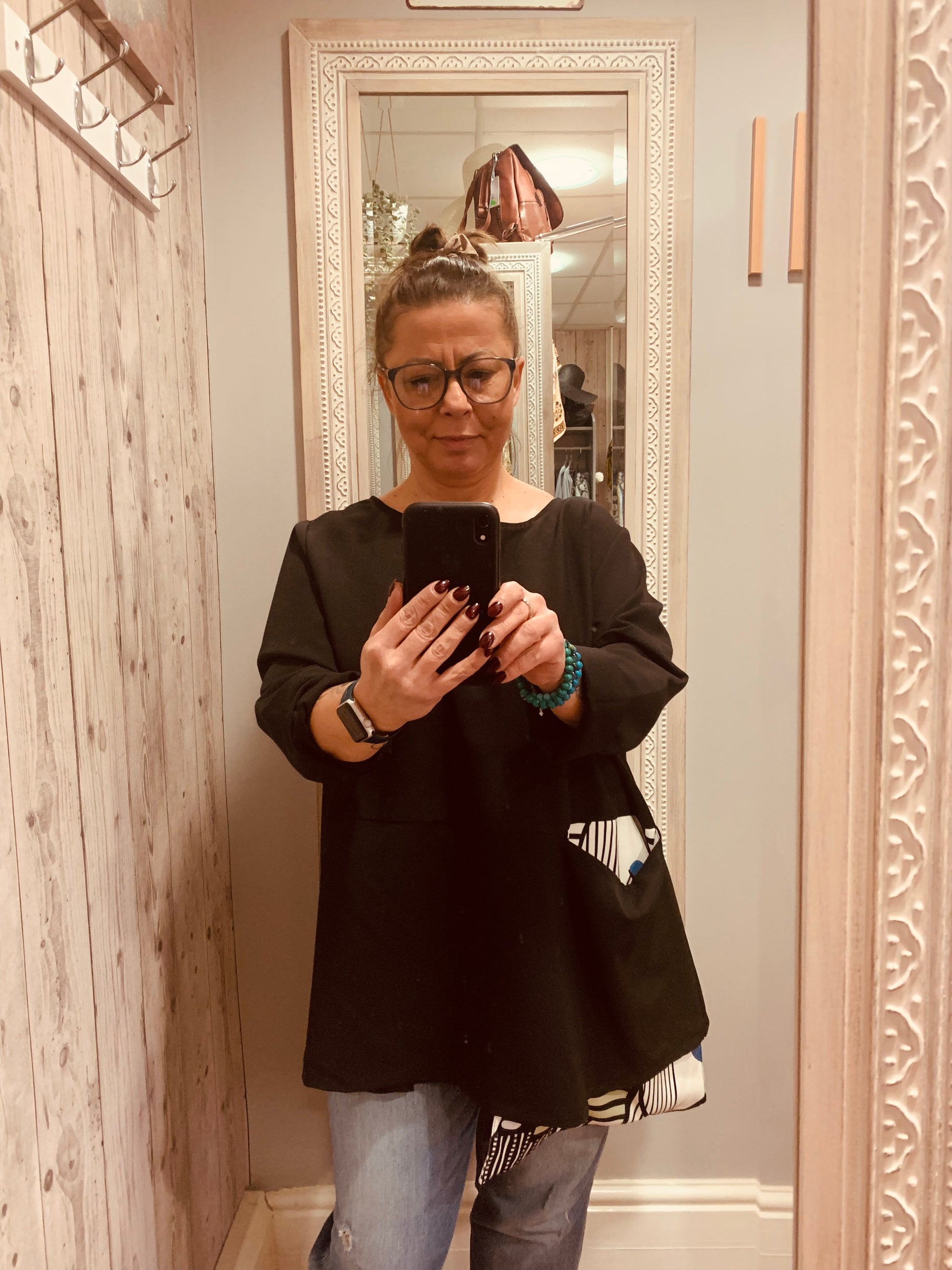 Oversized tunic with decorative pocket.
